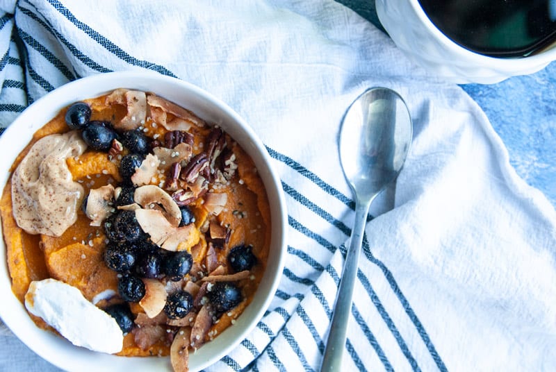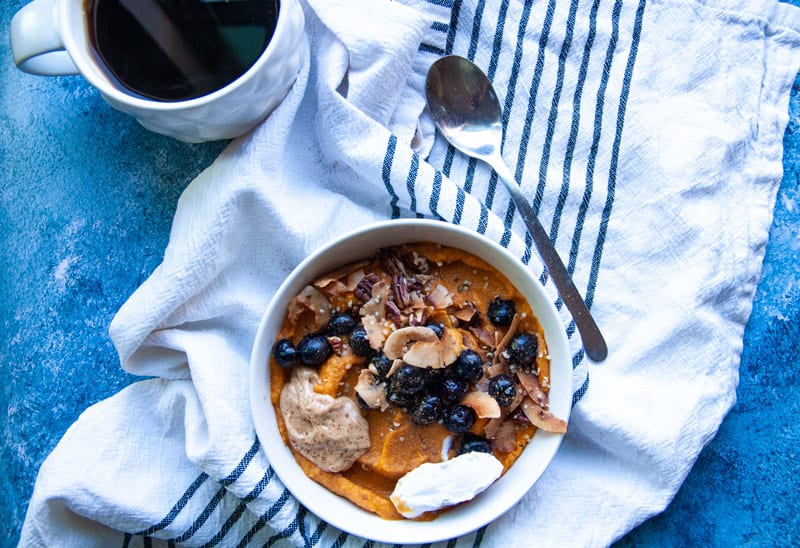 I topped my sweet potato breakfast bowl with some toasted pecans and coconut, blueberries, cashew butter, coconut cream, and hemp seeds. The textures and flavors were… OUT. OF. THIS. WORLD. Oh and if you add collagen peptides to this baby, it will add an additional 10 grams of protein. I use vital proteins, it’s great and doesn’t have any flavor.