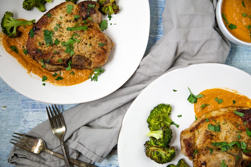 I am in awe of this Romesco Recipe, seriously. And then paired with some perfectly seared pork chops. Oh yes, It does not get much better.