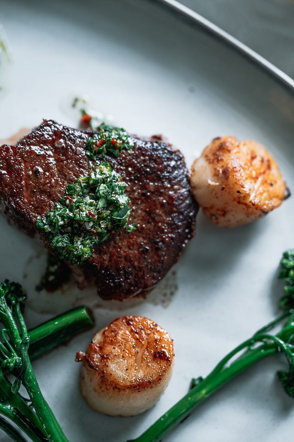 You are going to be cooking steak and scallop simultaneously. Don't worry, it's easy! Preheat oven to 400 degrees. Pat scallops dry. Patting them dry allows them to sear properly. Season with Salt and Pepper. Season steak choices with salt and pepper. You are going to sear your steaks first. Get an oven safe skillet and melt 1 tbsp of butter on medium-high heat. Once hot place seasoned steak in skillet for 2 two minutes undisturbed, flip and repeat. Once seared on both sides, pop it into the preheated oven. To serve rare set a timer for 4-5 minutes, med-rare 5, or medium 5-7 minutes. When done set aside to rest until you are ready to eat. While your steak is cooking get a saute pan hot with 1 tbsp butter and add your seasoned scallops. Cook to brown on one side 1-2 minutes and flip to cook for an additional minute. Turn off heat and remove from heat source. Serve with whatever side you would like you be like me and use broccolini!