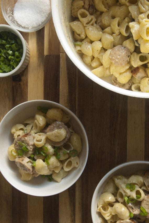 Finally, add the chicken sausage into the pan after you have cut it up. Just be sure that it is cooked through. After the noodles are finished, this mixture will get added into your Hatch Chile Greek Yogurt Mac and Cheese.While I am cooking the add-ins, my water is heating up for cooking the noodles.