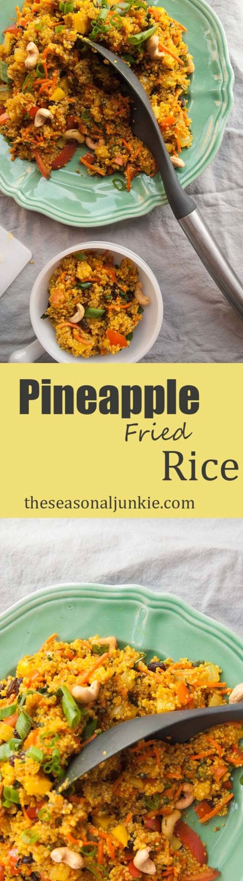 What is also awesome about pineapple fried rice is if you are thinking about meal prepping. You can stop looking. Because cough, cough, this is a perfect addition to a meal rotation. To make this pineapple fried rice one step shorter, I like to pre-cook my quinoa the night before and store in the fridge so really all the time intensive steps are done! And in my experience it comes out better. If you wanted to add some protein to the pineapple fried rice, it pairs really well with chicken and shrimp. Try it out!!
