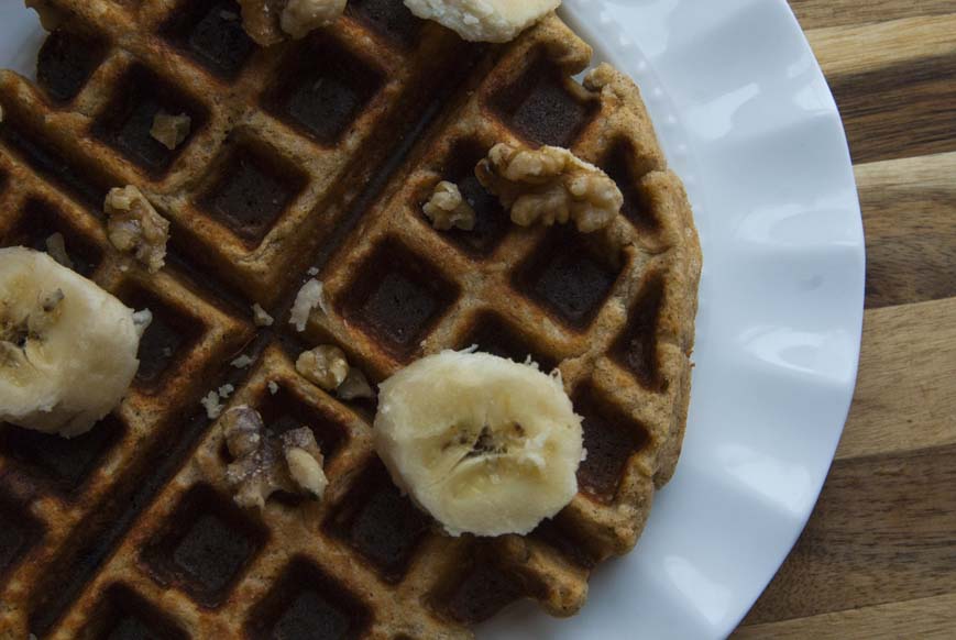 I tend to use bananas in most of my grain free waffles/pancakes, which lead to the thought…. Why not just have banana flavored waffles? A couple of walnuts later, the smell banana nut waffles took over my whole apartment. And I’m telling you, that is not a bad problem to have.