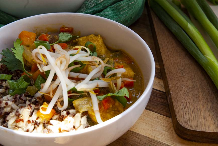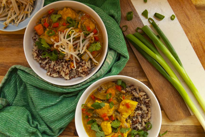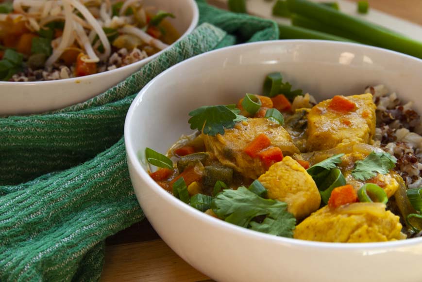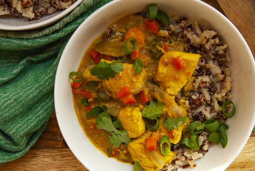 Chicken Coconut Curry can be served with many things ranging from jasmine rice or na’an bread. Something about dipping some fresh na’an bread into anything curry is enough to send me into culinary love. To keep things nutritious I served mine over a mixture of quinoa and brown jasmine rice. Let me tell you, it was perfection.