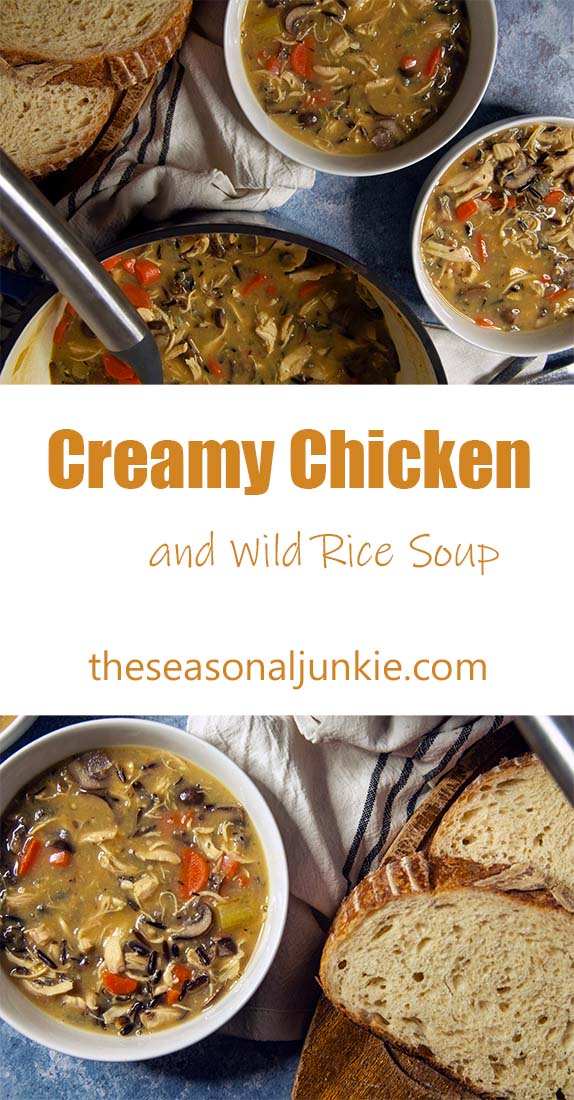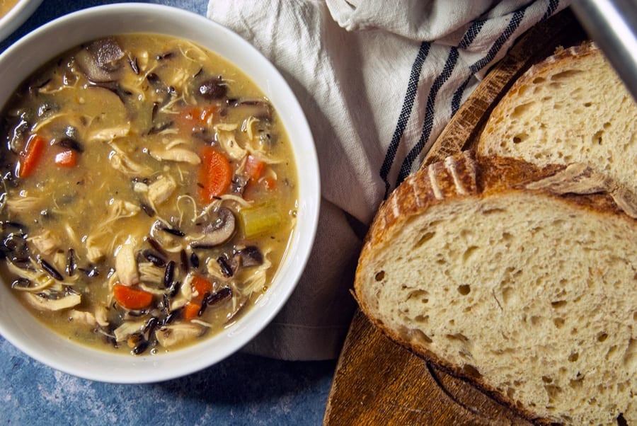It’s funny, or at least it’s funny in my opinion, the older I get, the more I crave recipes like this creamy chicken and wild rice soup. It is just too darn good! One bite and I’m instantly back to memories of trying to get off my soaked cold snow pants because my mom called for dinner. Shortly after, I would be greeted with a warm bowl of creamy chicken and wild rice soup. Obviously served with a crusty loaf of bread and butter.