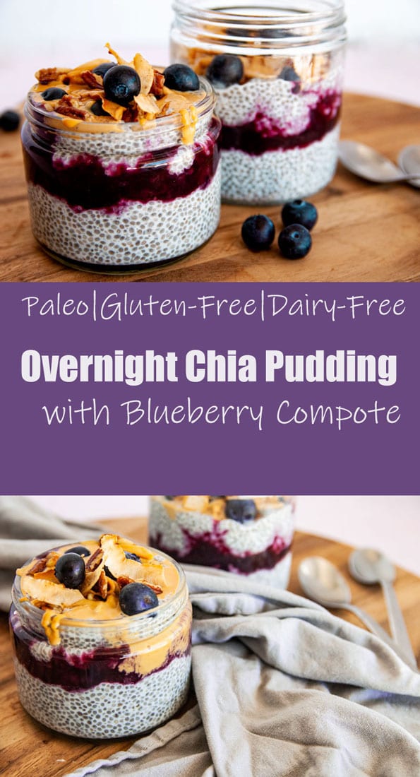 To assemble, layer 1/4 cup chia pudding at the bottom, spread 1-2 tbsp blueberry compote on top, layer another 1/4 cup of chia pudding, and spread an additional 1-2 tbsp of blueberry compote on top of that.