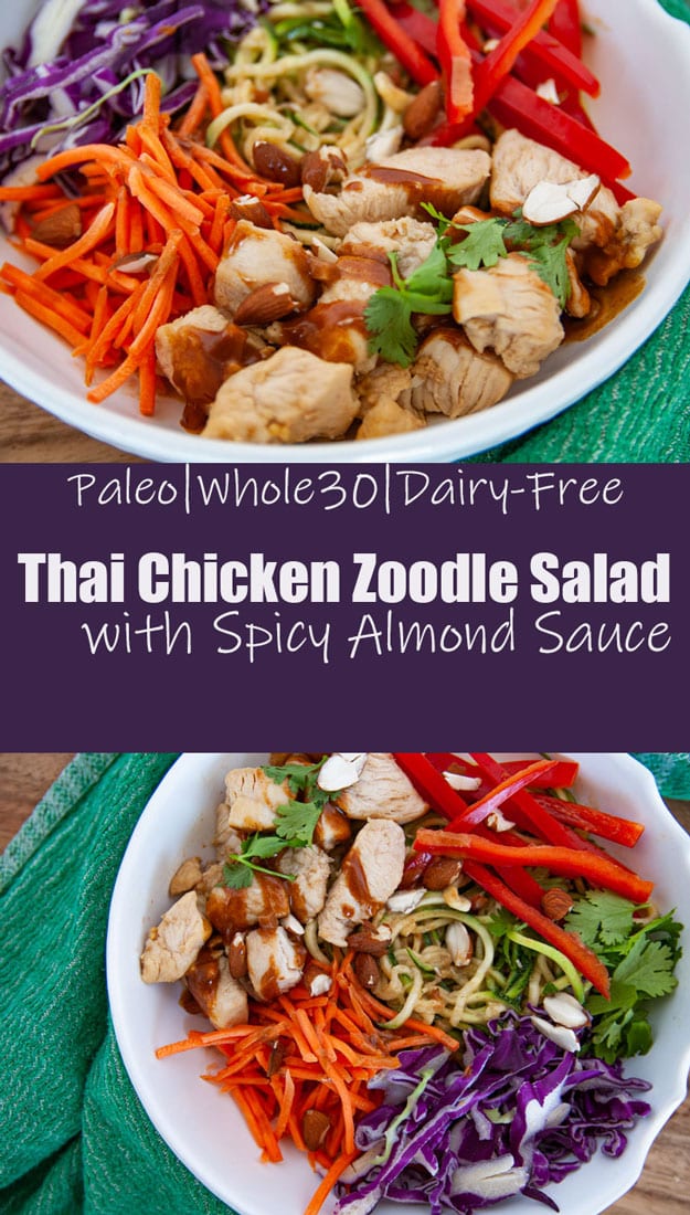 Now that we have that covered! Let’s talk about this Thai Chicken Zoodle Salad with Spicy Almond Sauce! So technically this recipe is Whole30, Paleo, and packed with flavor!