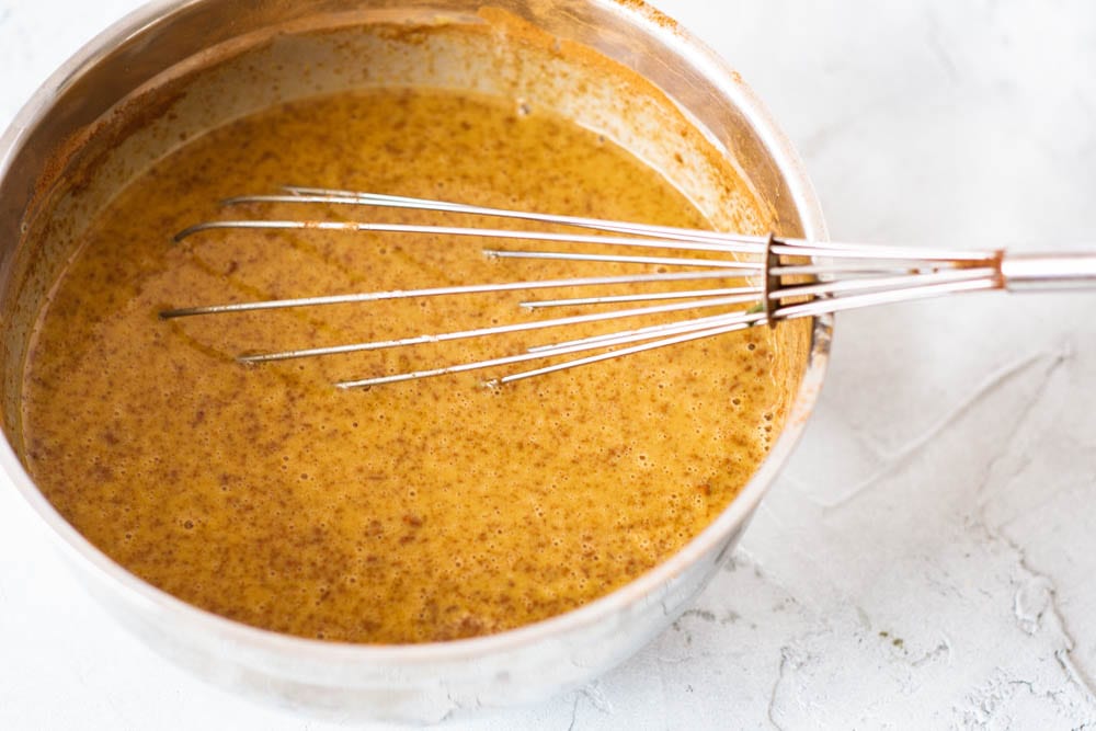 Put all your custard ingredients into a bowl and whisk to make the prettiest pumpkin custard you ever did see!