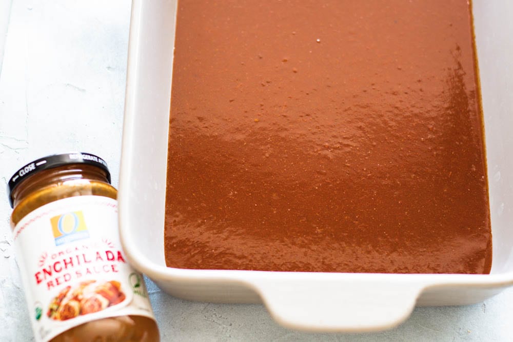 Mix all of your filling ingredients into a bowl and pour one jar of the red enchilada sauce in the bottom of your baking dish