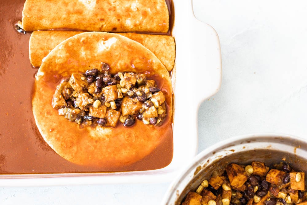 When sweet potatoes are done cooking, remove from oven and add to a large mixing bowl along with roasted green chiles, frozen corn, black beans. Mix to combine, give it a taste to see if you need to add more salt (some black beans come pre-salted), season to taste. dip tortilla in baking dish, add filling and roll (see picture above for clarification). You should be able to fit six on each side.