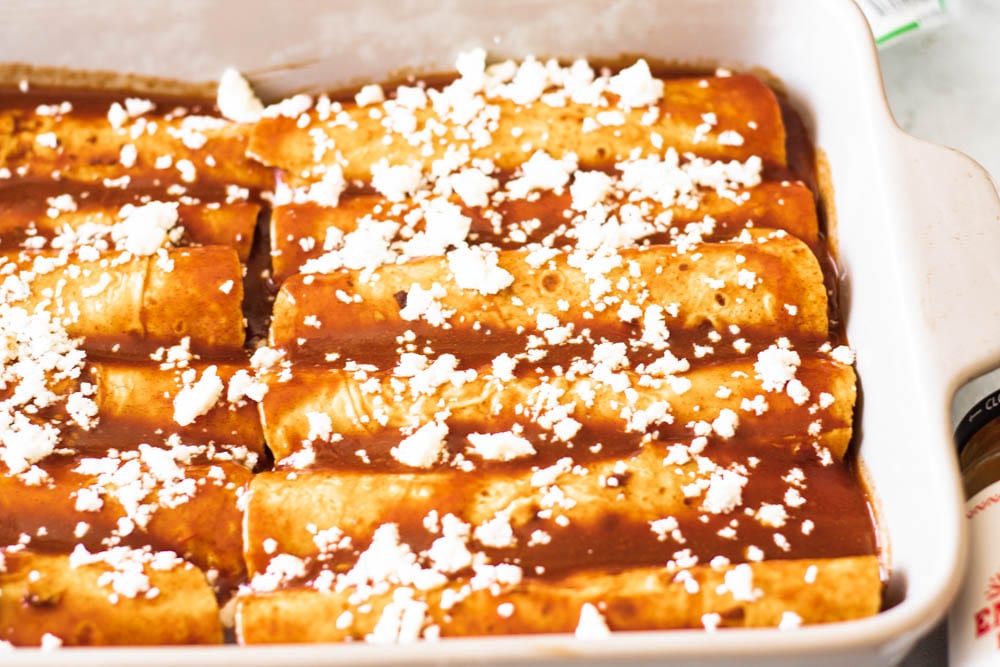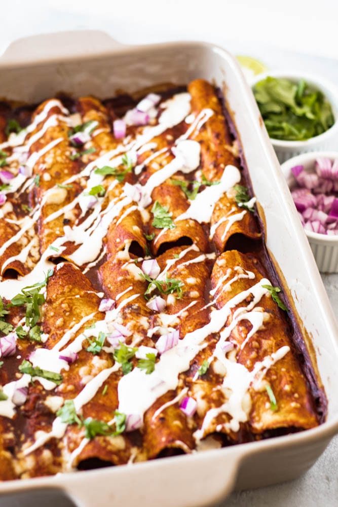 Typically we are a chicken and green chili enchilada family, but red enchilada sauce is sooo good! It complemented the black beans and sweet potato perfectly! Get ready for the best vegetarian enchiladas ever!