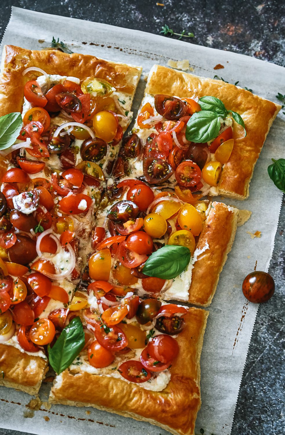 Deliciously flaky pastry topped with juicy, ripe tomatoes, aromatic herbs, and ricotta chese, creating a mouthwatering tomato tart bursting with flavor